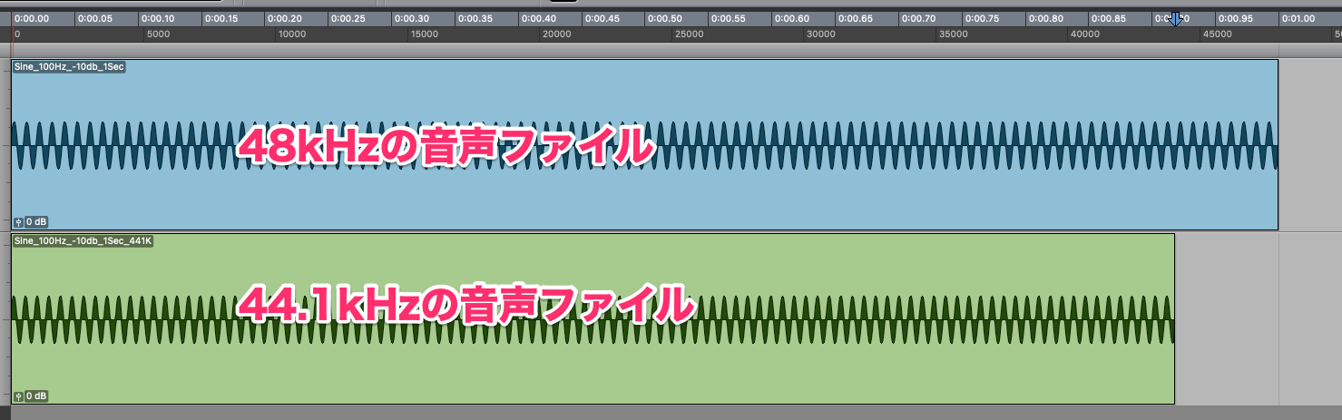 上の音声ファイルはセッションと音声ファイルのサンプリングレートが合っているため、1秒の波形として正しく認識されていますが、下の音声ファイルは44.1kHzのままなので、セッションが48kHzに設定されていると、3900サンプル分足短い音声ファイルとして認識されてしまいます。